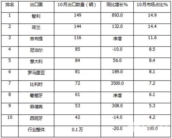 10月客车出口国:智利\荷兰\吉布提居纯电动前三