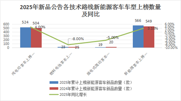 据统计,2025年工信部共计发布12个批次(第391批—第402批,下同)的新能源客车新品公告,累计上榜了566款新能源客车新品车型(含524款纯电动客车、23款燃料电池客车和19款插电式混动客车),比去年同期的549款增长3.1%。