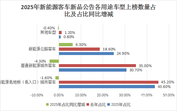 总之,在2025年新能源客车新品公告上榜的各用途车型中,低入口(低地板)居榜首,公路客车增长近4成领涨。
