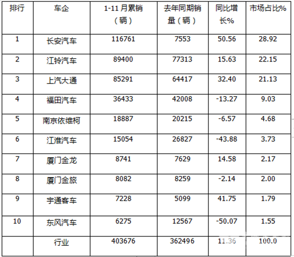 特点五、前11月累销:长安领跑;江铃、大通分列二、三;TOP10同比5增5降,长安领涨