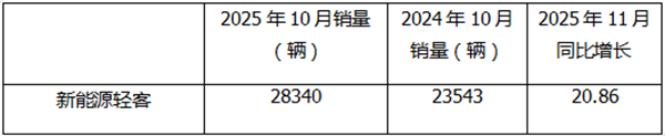 表1,2025年11月新能源轻客同比增长20.86%(数据来源:终端上牌信息)