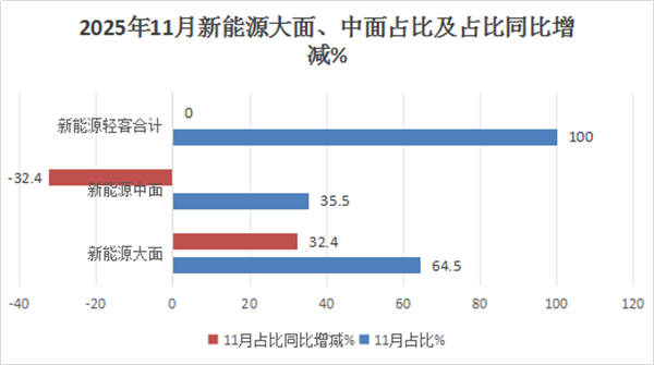由于新能源轻客包含新能源大面(含5.5米以上新能源轻客)及中面(含4.5米--5.5米新能源轻客)车型。根据终端上牌数据,2025年11月新能源轻客中的新能源大面及中面销量及同环比、占比及占比同环比增减: