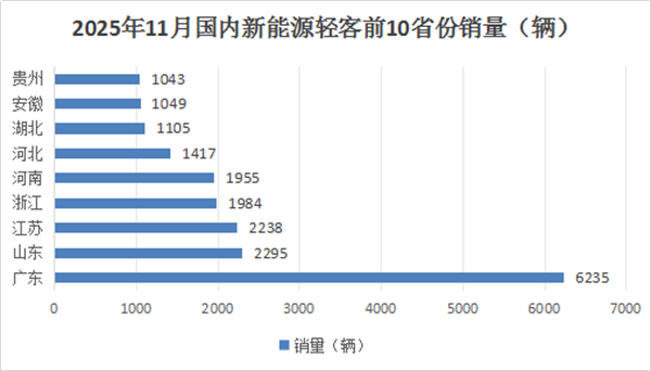 上图可见,2025年11月国内新能源轻客各省级区域市场流向中,广东、山东、江苏居前三,且这三省销量均超2000辆,特别是广东省独家销量超6000辆(6235辆),可谓一家独大,表现突出;其余省份销量均在2000辆以下。