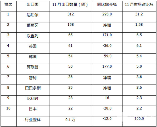 11月客车出口国:尼泊尔\葡萄牙\以色列居纯电动前三