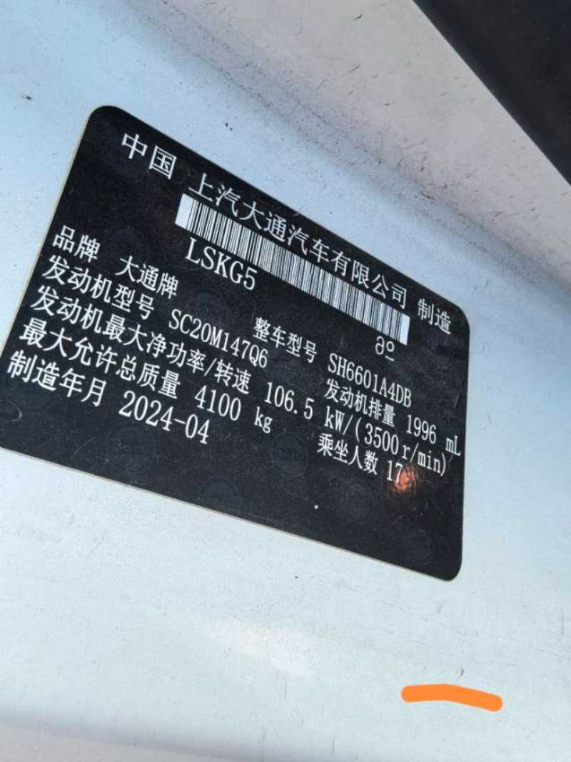 客车品牌 | 上汽大通 | 上牌时间 | 2024-05-21 |