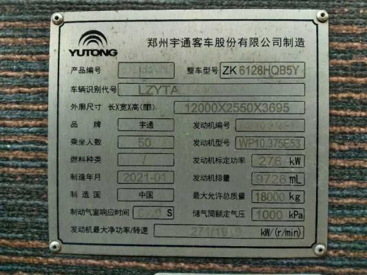 客车品牌 | 宇通客车 | 上牌时间 | 2021-01-20 |
