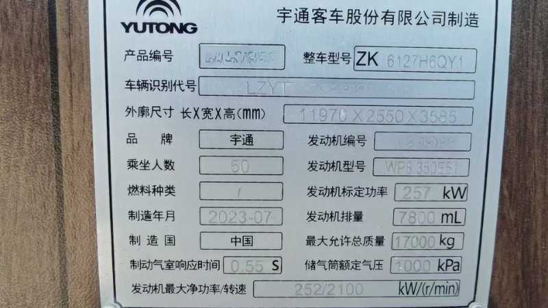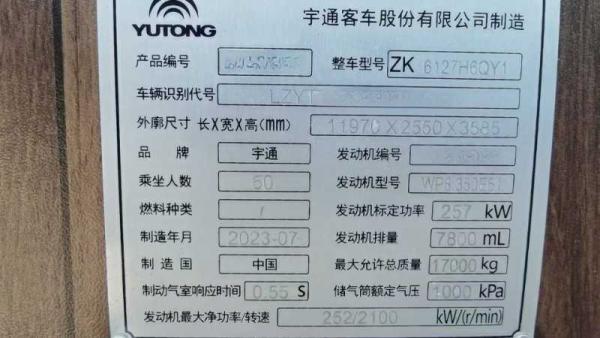 客车品牌 | 宇通客车 | 上牌时间 | 2023-08-22 |