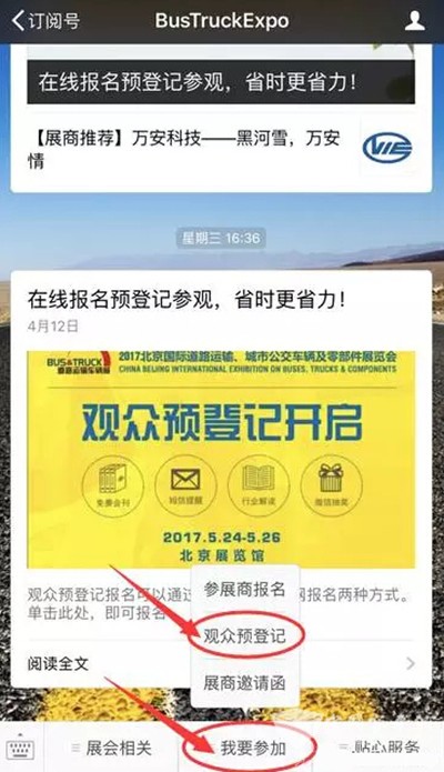 您可通过官网www.bustruckexpo.com点击登记,也可以通过交通行业会展微信平台BusTruckExpo菜单:我要参观>观众预登记 进入预登记服务。
