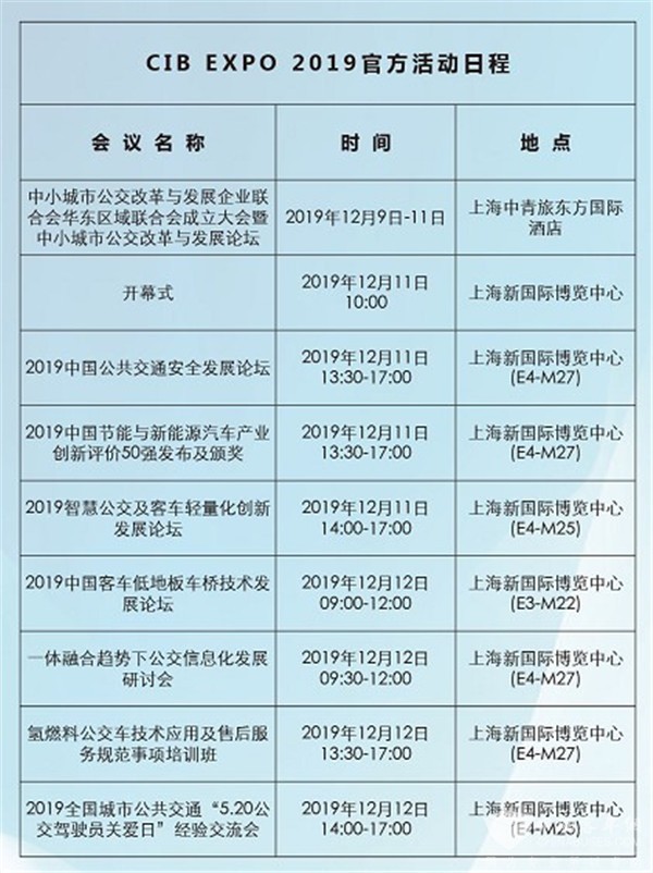 由中国土木工程学会城市公共交通分会、城市交通网、晟格会展(上海)有限公司共同主办的「2019上海国际客车展览会暨上海国际氢燃料电池展览会」(以下简称:CIB EXPO上海国际客车展)于2019年12月11日在上海新国际博览中心隆重开幕!