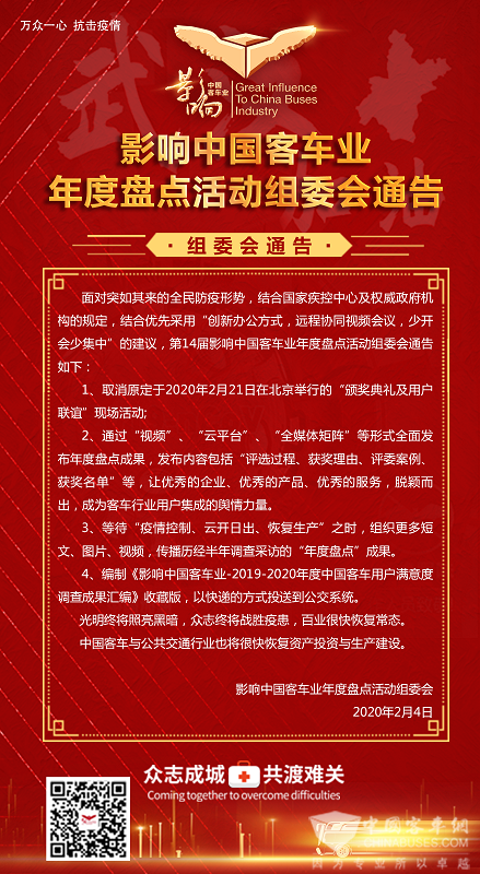 面对突如其来的全民防疫形势,结合国家疾控中心及权威政府机构的规定,结合优先采用“创新办公方式,远程协同视频会议,少开会少集中”的建议,第14届影响中国客车业年度盘点活动组委会通告如下: