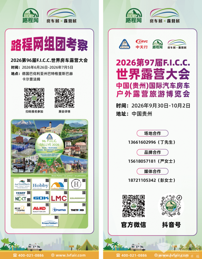 2026年9月,路程网将作为战略合作伙伴,在贵阳支持举办与第97届F.I.C.C.世界房车露营大会深度联动的中国(贵州)国际汽车房车户外露营旅游博览会。2026 年 6 月 26 日至 7 月 5 日,第 96 届 F.I.C.C 世界房车露营大会将在德国巴伐利亚州的巴特格里斯巴赫、卡普夫哈姆举办,路程网也将正式组织同行考察团前往交流学习。这一系列布局,彰显了其整合全国乃至全球产业资源,持续推动中国房车露营文化普及与产业升级的决心与实力。