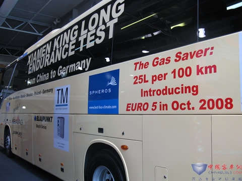第62届汉诺威国际商用车展览会上,厦门金龙作为中国客车业的代表,带着金龙XMQ6127、XMQ 6900、XMQ 6121 G EU-4等三台通过ECE认证的精品车型参加展示,与欧洲客户一起分享中国客车业的成果,这三款车型全部装用康明斯柴油发动机,其售前的环保要求、售后服务等都将被纳入到美国康明斯欧洲区域的范围。其中参展的金龙XMQ6127豪华型客车,已经是商品化交付车辆,十天前交付用户的客车,应用户要求,由接车用户从陆路行驶的方式,开到汉诺威。68岁的车主及金龙欧洲的经销商一起,从新疆霍尔果斯口岸起,利用了整8天时间,行程7500公里,顺利抵达汉诺威,加上从厦门到新疆口岸的国内行程5000多公里,连续总行程达12500公里,非公路行驶条件近3000公里,成为汉诺威IAA国际商用车展览会上绝无仅有的经过商品化的、长距离的、长时间的行车考验的参展车型,成为汉诺威IAA国际商用车展上的一大亮点。发动机作为这一过程最核心的装备,康明斯在长时间连续行驶的可靠性与安全性方面又一次成功地接受了考验。