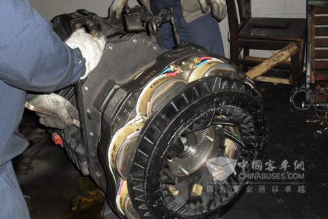 据邹经理介绍,在不影响变速箱使用的情况下,将一体式变速器中的液力缓速器改成电涡流缓速器在国内外尚属首次,其主要解决了三个技术难点。第一,解决原有的变速器上的齿轮组、液力偶合器、速度传感器的拆卸、契合问题;第二,为了保证变速箱的密封性、连接性的完好,以及安装电涡流缓速器需要重新设计制造专用后端盖和输出法兰等零件;第三,缓速器控制器的匹配。