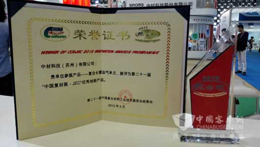 第21届中国国际复合材料工业技术展览会是亚太地区规模最大、最具影响的复合材料行业展览会,于2015年9月2日至4日在上海世博展览馆拉开帷幕。中国国际复合材料工业技术展览会还是唯一经国家科学技术部批准的国际性复合材料专业展览会,经历20届的成长,已经成为亚洲地区规模最大的复合材料行业盛会,被业内称为"复合材料行业的风向标"。历届展出内容涵盖复合材料全产业链,涉及各种原材料、工艺设备和复合材料制品,包括玻璃纤维、碳纤维、芳纶纤维、玄武岩纤维,以及上述增强材料的制品,以实物展出、现场操作演示、专业讲解等多种形式开展技术交流与经贸洽谈。中材科技(苏州)有限公司是一家有着丰富经验的国家级高新技术企业和全国首批创新型试点企业,在产品的设计、整体制造技术水平、生产线自动化和复合气瓶生产规模等方面均居国内同行业领先。其新产品--复合长管运气单元,获得了第21届中国国际复合材料工业技术展览会的创新产品奖,参加了9月2日上午11:00在创新产品新闻发布会会场(上海世博展览馆2号馆)召开的"中国复材展-JEC"创新产品颁奖大会。随后,"复合长管运气单元"将专门展览在"创新产品展区"。