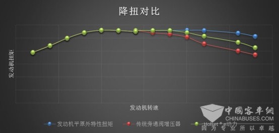 在高原地区,随着海拔的升高,空气越来越稀薄,发动机的进气量也随之降低。发动机高原标定的特点是只要烟度,排温,增压器转速三者中任何一项超过限值就需要进行减油标定,即通过降低喷油量来限扭,因此,发动机的性能发挥受到严苛的指标限制。传统增压器在高原地区排温较高,导致发动机性能发挥受限。而Holset® e动力主动控制增压器旁通阀闭合进行进气量的主动补偿,提高发动机空燃比,降低排温,使发动机的高原能力大幅提升。