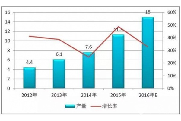 2012-2014年,锂电池正极材料增长主要由手机、平板、移动电源等带动,但历年增速呈下滑态势,由此说明数码市场增速开始趋于饱和。2015年,受新能源汽车动力电池爆发带动,正极材料市场增长强劲,2015年,中国正极材料产量达11.3万吨,同比增长49%。
