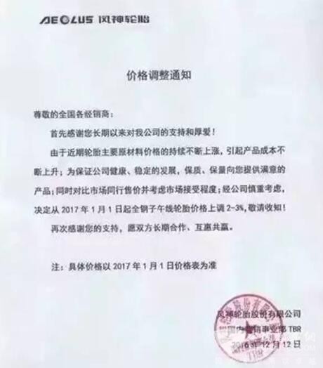 2016年12月20日消息:近日,风神轮胎股份有限公司发布价格调整通知。