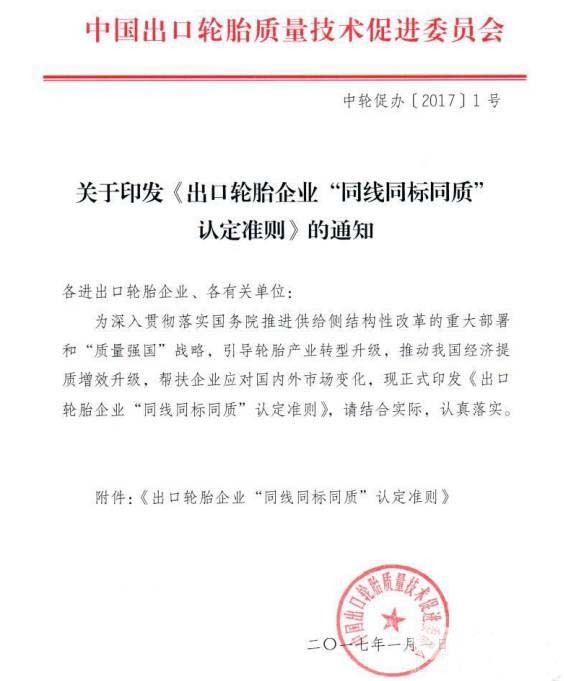 2017年1月6日消息:近日,中国出口轮胎质量技术促进委员会正式印发《出口轮胎企业“同线同标同质”认定准则》(下称认定准则)。
