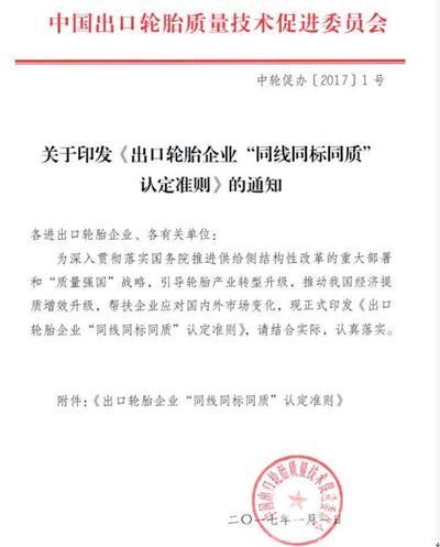 2017年1月1日,中国出口轮胎质量技术促进委员会印发《出口轮胎企业“同线同标同质”认定准则》。