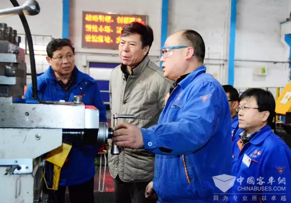 在客车变速器生产现场调研时,严鉴铂董事长要求宝鸡厂区相关单位想方设法为装二车间提供各项基础保障,保质保量完成客车变速器不断上涨的市场订单,以质量可靠、性能稳定的产品赢得新用户的信赖。随后,严鉴铂董事长来到精益物流现场,要求完善仓储管理系统的运行工作,加快生产系统信息化进程。在模具加工现场,严鉴铂董事长详细了解了模具加工能力和技术工人培养情况,并与一线员工亲切交流,询问模具加工技术要点和生产难点,勉励员工立足岗位、苦练本领,为提高企业模具生产水平作出贡献。