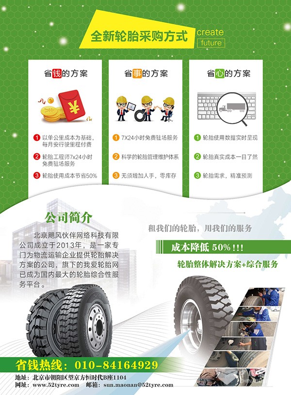 目前,国内广大物流企业的成本上升、竞争加剧。其中,油料、人力和轮胎构成了物流企业成本的"三要素"。油料的价格受国际经济政治大环境的影响很大,而人力的成本近几年又呈极具上升的态势,因此"三要素"中唯一可控的就是轮胎成本。而目前,大多数物流企业的轮胎采购方式还停留在"一手交钱、一手交货"的传统模式中。这种模式效率低,物流企业资金压力大,且得不到有效的专业服务。