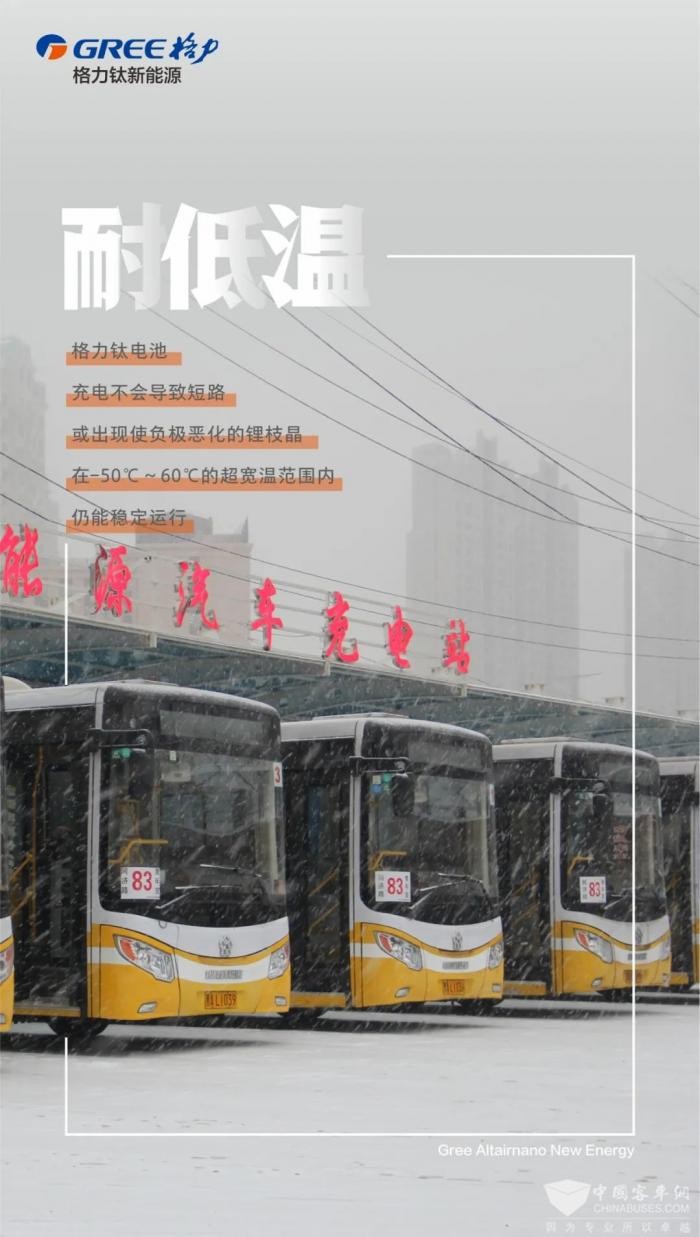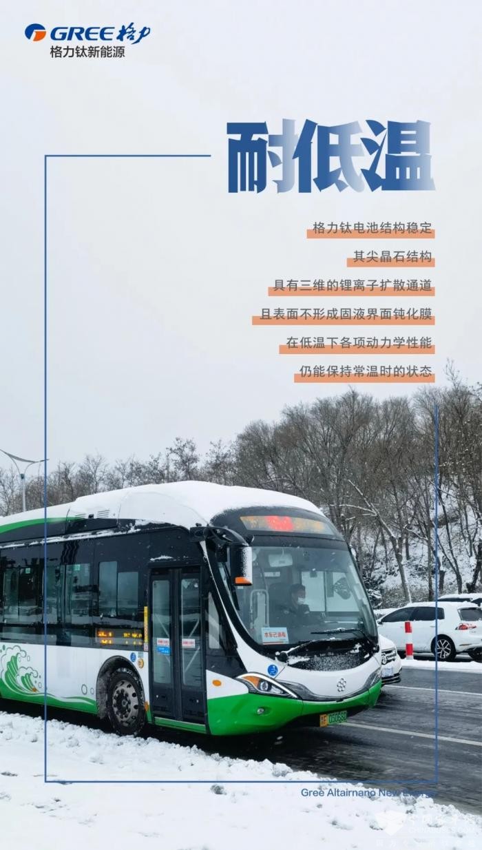 搭载格力钛电池的公交车辆,已在烟台、哈尔滨、包头、延吉等北方城市安全运营多年,非常适合低气温严寒地区。
