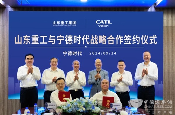 2024年9月14日,山东重工集团与宁德时代在福建宁德举行战略合作签约仪式。山东省委书记、省人大常委会主任林武,山东省委常委、秘书长范波,山东省国资委党委书记、主任暨山东重工集团党委书记、董事长满慎刚;宁德时代董事长兼CEO曾毓群,监事会主席吴映明,董事长助理、企业策划部部长曲涛出席并见证签约。山东重工集团党委副书记、总经理暨中国重汽集团党委书记、董事长王志坚,宁德时代市场体系联席总裁韩伟代表双方签约。