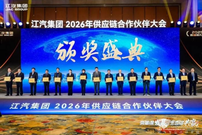2025年12月19日,以“变革谋发展,生态促共赢”为主题的江汽集团2026年供应链合作伙伴大会在合肥隆重召开。大会回顾了过去一年供应链上下游企业同舟共济的奋斗历程,共同擘画了新一年高质量发展蓝图。在备受关注的年度表彰环节,东风德纳车桥凭借卓越的产品质量与稳定的供应保障,再次荣获江汽集团颁发的2025年度“质量领先奖”。