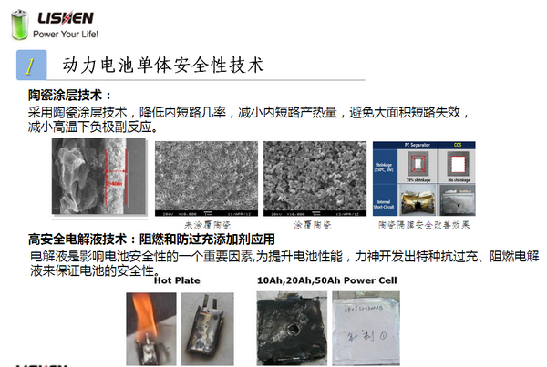 首先,我们公司动力电池单体安全技术,包含三个方面:隔膜、电解液、生产制造。关于隔膜,我们公司用的是陶瓷涂层技术,能够降低内短路几率,避免大面积短路失效。电解液方面,应用了阻燃、防过充添加剂,有更好的安全性和稳定性。我们公司制造过程当中,采用世界先进的电池生产设备,整个过程完全自动化。生产车间为全干燥环境,严格控制制造过程中水分和粉尘,有效保证电池的安全性。
