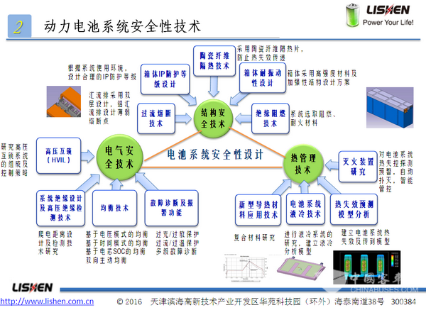 关于电池系统的安全技术,分为三个方面:结构安全技术、电气安全技术、热管理安全技术。我们在设计任何一个部件之前,都会考虑这三个方面。这里做一个简单的例子,比如说最简单的汇流排设计,在结构方面考虑抗震和绝缘层的老化,在热管理方面,我们要考虑过流,过流能力是不是会发热。
