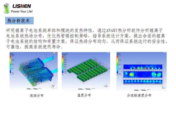 热分析技术;我们公司通过ANASY流程分布和温度分布的分析,对电池的结构和布置提供一个方案,我们根据方案去设计我们电池系统,能保证我们热场分布,从而保证系统的安全性和可靠性,提高系统的寿命。