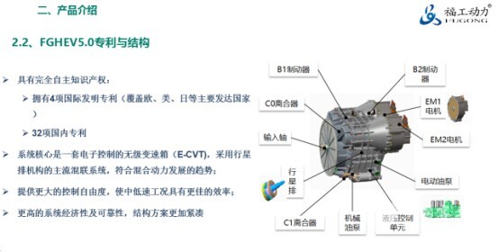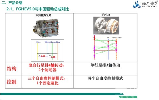 众所周知,目前在世界公认最先进、最好的是丰田的总成,历经20年推广数量有一千万辆,目前运行非常稳定,它是基于单行星排动力分流的系统,我们在这一块进行深入的创新,带来了复合行星排动力分流的系统,我们希望把这个性能优于丰田的系统应用于商用车的领域。为什么性能上能优于丰田的系统,我从结构上向大家做一个介绍: