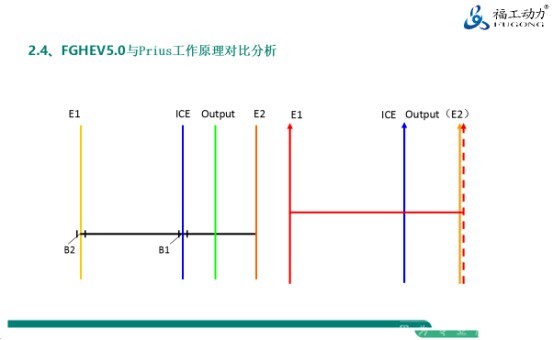 我们通常用杠杆图的形式表达的动力分流行星排结构,左边是福工系统架构,右边是丰田的系统架构,我们双星排是四个轴,中间蓝色是发动机,绿色是输出,然后E2是大电机,大家看到丰田的输出跟E2在同一个轴上的,它一个固定的速比,E2一定跟发动机的速度按照固定速比的。我们在E1与发动机上面分别有两个制动器,在纯电动起步的阶段,我们两个电机可以同时驱动,丰田只能靠E2单独驱动,发动机启动的过程是一样的。