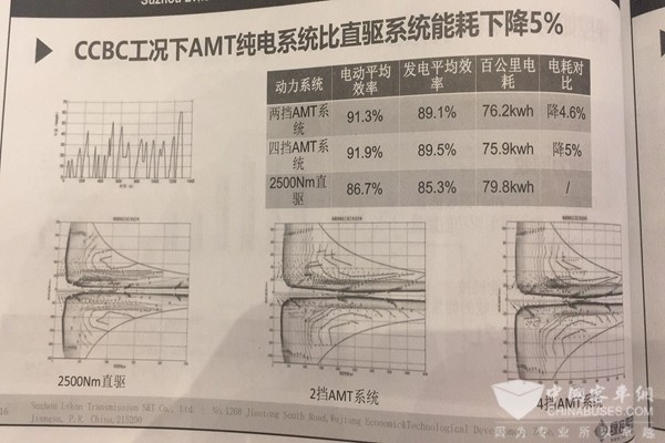 目前,绿控集团的产品主要有四种,第一种是基于AMT的并联混合动力总成,第二中是基于AMT混联的混合动力总成,第三种是纯电动的动力组成,第四种是AMT变速箱本身。对于并联和混联系统,主要从怠速停机、制动能量回收和发动机工作点优化三个方面达到节省燃料的目的。在个怠速停机环节,对于中国的典型城市工况,大概54%都处于怠速的时间,怠速的油耗约为1.5L/h,传统车辆能耗也大概在5L左右,而AMT混合动力系统采用行车起停技术,可以直接就省掉了该部分油耗;在制动能量回收环节,城市客车总是处于加减速的工作状态,传统车辆在减速时车辆动能通过制动器的摩擦生热发生损耗,而混合动力车辆将这种机械能转化成电能,一百公里回收的能量大概就相当于8.7L的燃油能量。在发动机的工作点优化环节,同传统车辆相比,低速的起步效率较低,通过基于AMT的混合动力,可以改善低速起步的工况。