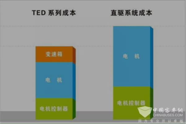 纯电动客车的驱动系统,以往普遍采用的是直驱电机,由于当前铜、稀土等原材料成本的大幅上升,也导致驱动电机的成本居高不下。相比而言,带AMT的纯电动系统(以绿控推出的TED系列产品为例),采用了扭矩小很多的电机,电机的成本大幅下降;由于采用的原材料更少,所以电机对原材料价格的敏感度也更低;另外,电机控制器比直驱电机要小,该项的成本也相对更低。即是说,即使加上AMT变速箱,绿控TED系列产品的成本也要低于同级别的直驱电机。