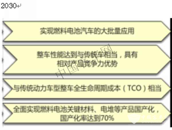 2016年10月26日,中国汽车工程学会在其年会上发布了《节能与新能源汽车技术路线图》,其中关于《燃料电池汽车技术路线图》2020年——2030年发展规划如下所示: