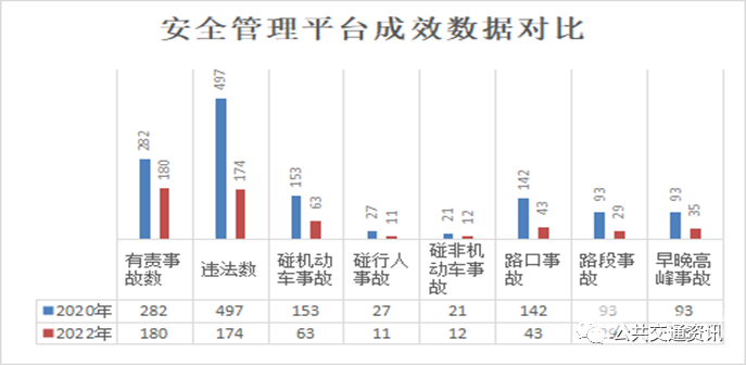 2.有关成效:通过数字化管理,南京公交实现了安全管理的健康发展,实现事故、违法数的逐年下降。有责事故数从2020年的282起下降至2022年180起,下降了35%;违法数从2020年的497起下降至2022年174起,下降了65%;碰机动车事故由2020年的153起,下降到2022年的63起,下降了60%;碰行人事故由2020年的27起,下降至2022年的11起,下降了59%;碰非机动车事故由2020年的21起,下降至2022年的12起,下降了43%;路口事故由2020年的142起,下降至2022年的43起,下降70%;路段事故由2020年的93起,下降至2022年的29起,下降69%;早晚高峰事故由2020年的93起,下降至2022年的35起,下降62%。