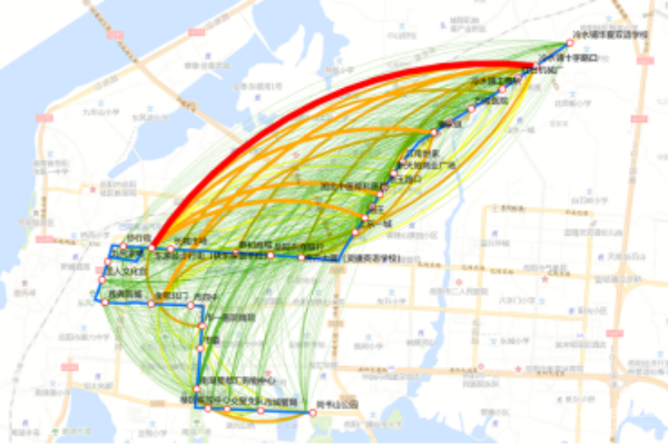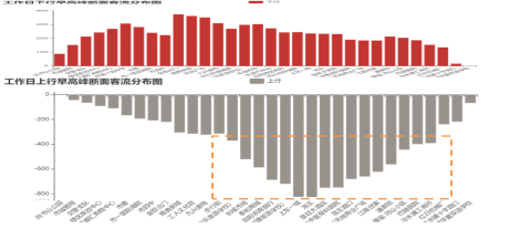 (2)案例应用 通过分析线路的客流出行分布,如果客流具有集散方向集中、长距离出行需求高的现象,相对比较适用大站运营的模式。如下图所示线路,该线路具有明显的几处上客量较大的站点,而这些站点之间又有明显的出行联系,通过结合站点上客量及OD对可以确定该线路具体的大站停靠站点。 在具体的运营中,还需要根据具体客流情况,确定大站线路是高峰期间运营,还是全天运营。