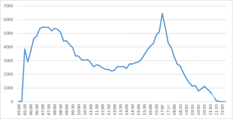(2)案例应用 一般应用在短时间内客流较高的情况。如下图所示的线路,在早上5:30的时候客流激增,如果按照正常的一辆一辆的发出,由于车辆核载人数的限制,就会有站台滞留乘客的现象,这种情况就需要几辆车编为一组同时发出。