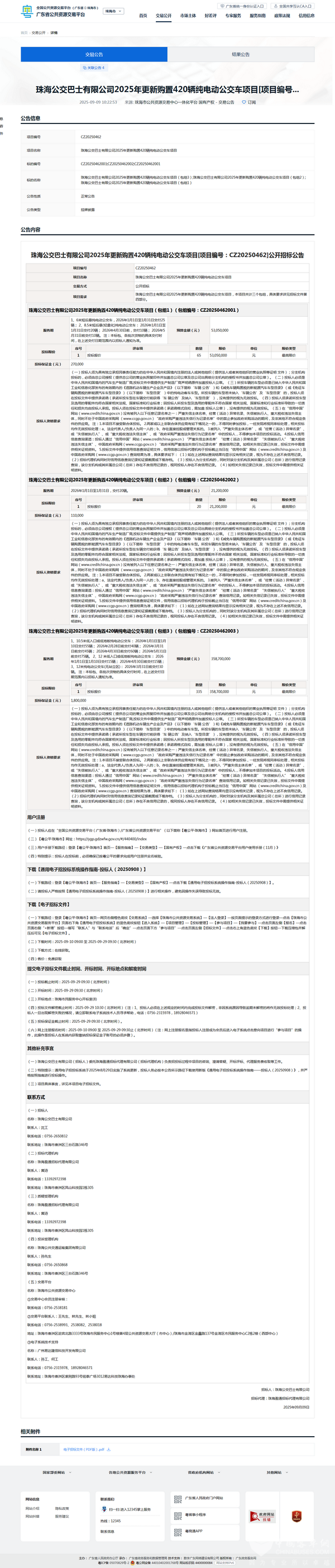 珠海公交巴士有限公司2025年更新购置420辆纯电动公交车项目