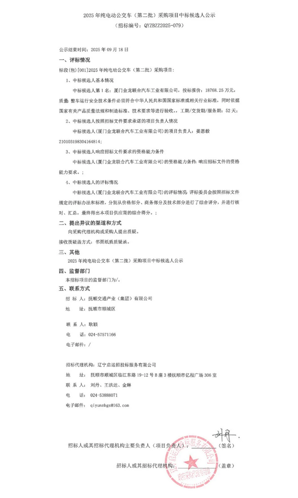 2025年纯电动公交车(第二批)采购项目中标候选人公示
