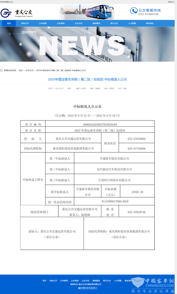 2025年营运客车采购(第二批)标段四 中标候选人公示