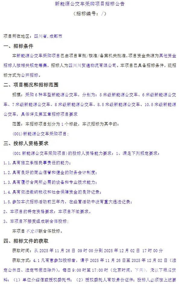 - 攀枝花市公交发布120辆新能源公交车采购招标公告