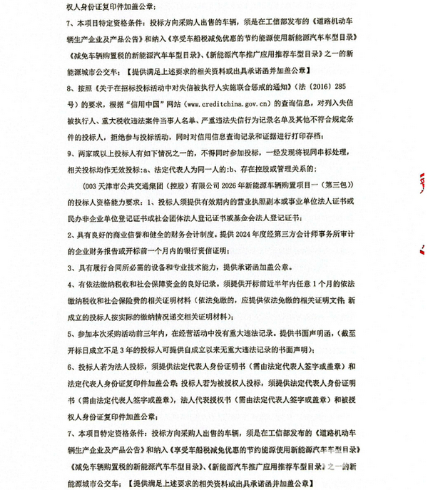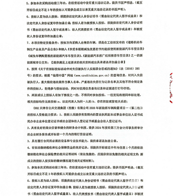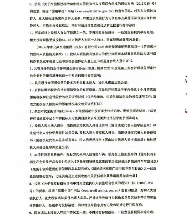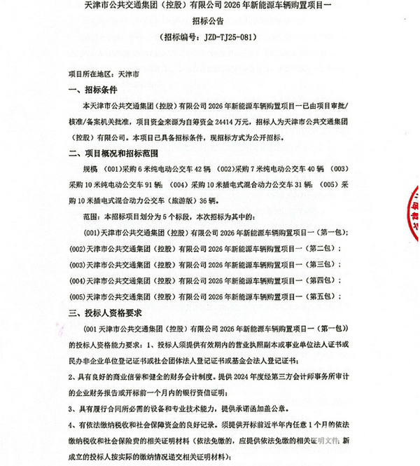 - 天津市公共交通集团2026年新能源车辆购置项目一 招标公告