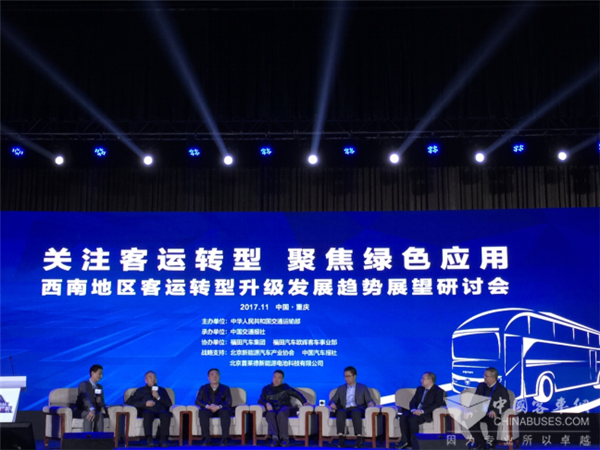 启动仪式后,重庆市道路运输管理局副局长王起、中国交通报社副总编辑陈林、北京新能源汽车产业协会副会长兼秘书长赵景光、交通运输部科学研究院高级工程师、交通科技传媒总编辑熊燕舞,以及重庆交通运输控股集团有限公司副总经理唐玉才、遵义市公共交通(集团)有限责任公司副总经理张蕾等行业专家、用户代表亮相研讨会环节,并就“客运转型升级发展趋势展望”主题,提出重要宝贵意见。