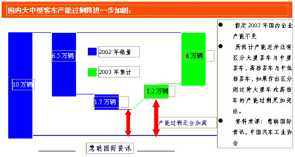近年来,由于旅游行业的发展,大大拉动了国内高档大型客车需求的增长,2002年全年国产大型客车17296辆,销售16668辆,较2001年增幅分别为50.45%和45.81%(资料来源:中国汽车工业协会),而其中单价140万元以上的大型客车2002年销量为889辆,2001年销量为706辆,同比增长25.9%(资料来源:慧聪国际资讯)。从中型客车看,2002年表现出了明显的萎缩趋势,2002年国内中型客车产量下降了2.39%,销量下降了1.77%(资料来源:中国汽车工业协会)。由于近两年来国内汽车工业整体的高速增长,很多企业纷纷扩大了自身产能,据估计,全国大、中型客车的产能早已超过了10万大关。从2002年下半年金龙与宇通的价格战便可看出这一行业已经出现了一定的产能过剩的局面,因此有理由相信在接下来的一段时间内这种过剩局面会进一步扩大。