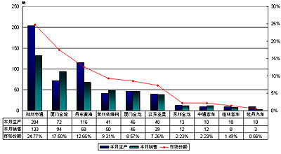 11-12米客车本月销量所占总销量13.03%,比1月相比减少5.22%。本月这一区段生产为662辆,销售为537辆。下表集中10家客车企业的销量所占本区段总销量86.59%。从表中也可以看出头郑州宇通牢牢把住头把交椅。从02、03年来看2月销量都是最低谷,一是春节影响,二是工作时间短。