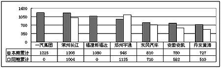 1~5月份大型客车企业(27家)累计销量排名前五家企业分别是常州长江、一汽集团、郑州宇通、福建新福达和安徽安凯。其中前五家的市场份额占整个行业的56.74%,常州长江(13.2%)、一汽集团(13.06%)、郑州宇通(11.45%)、福建新福达(10.53%)、安徽安凯(8.49%)。除郑州宇通(-19.34%)外,其余四家均有增长。本期大型客车企业累计销量是9257辆,与同期累计相比增幅为59.66%,多数大型客车生产企业本期累计销量比去年同期呈现不同程度增长,其中以苏州金龙本期累计增长为85.71%,广州骏威本期累计增长为96.83%,长城汽车本期累计增长为80.49%,广州五十铃本期累计增长为154.55%和沈飞客车本期累计增长为572.73%最为明显。同时,还有七家企业的销量出现不同程度的下降。