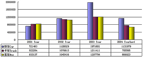 年初,从全国交通工作会议上得知:2003年共完成交通基础设施投资3900亿元,同比增长12%,其中公路建设完成3500亿元,同比增长9%。2003年新增公路通车里程4.6万公里,其中新增高速公路4600公里,全国公路通车里程达到181万公里,其中高速公路近3万公里,实现了"五纵七横"国道主干线系统第一阶段建设目标。受交通部《收费公路车辆通行费车型划分》标准影响,39座客车将有可能成为2004年亮点。农村公路建设力度之大前所未有,全年共完成新改建农村公路10.2万公里;2004年新改建农村公路10万公里。公路建设的如此快速发展和交通基础设施投资之大,无疑为扩大公路客车市场提供了广阔前景。