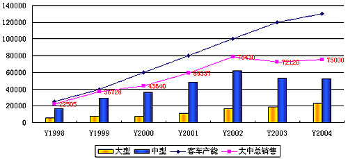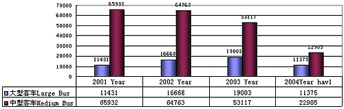 大型客车连续三年以平均30%的速度增长,大型客车占大中型客车的比例由2001年的14.8%上升为2004年的33.2%,足矣显示客车大型化趋势,这与我国客车发展方向保持一致。由于高速公路的发展,人民生活水平的提高,对客车档次和乘坐舒适性提出更高的要求,加之,大中型客车厂商竞争加剧,促进了客车产品质量和档次的提高。